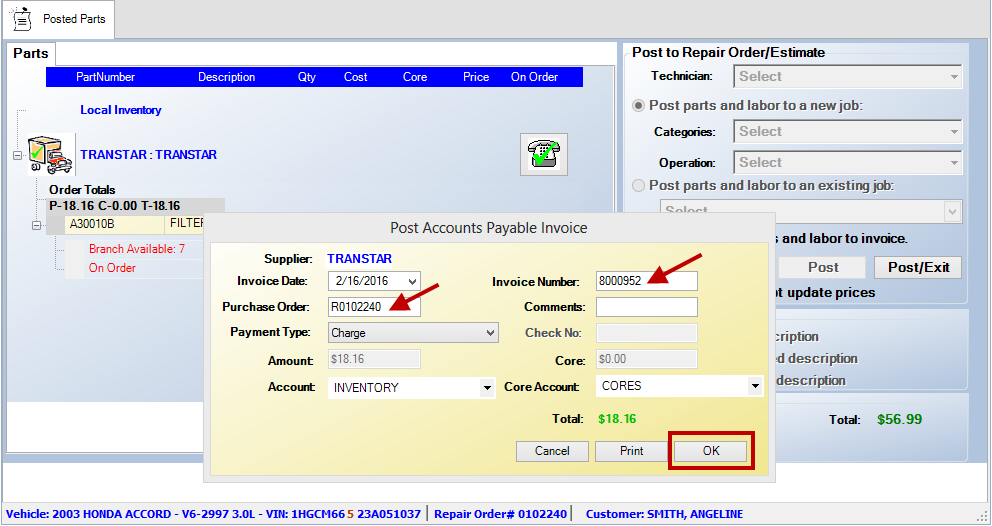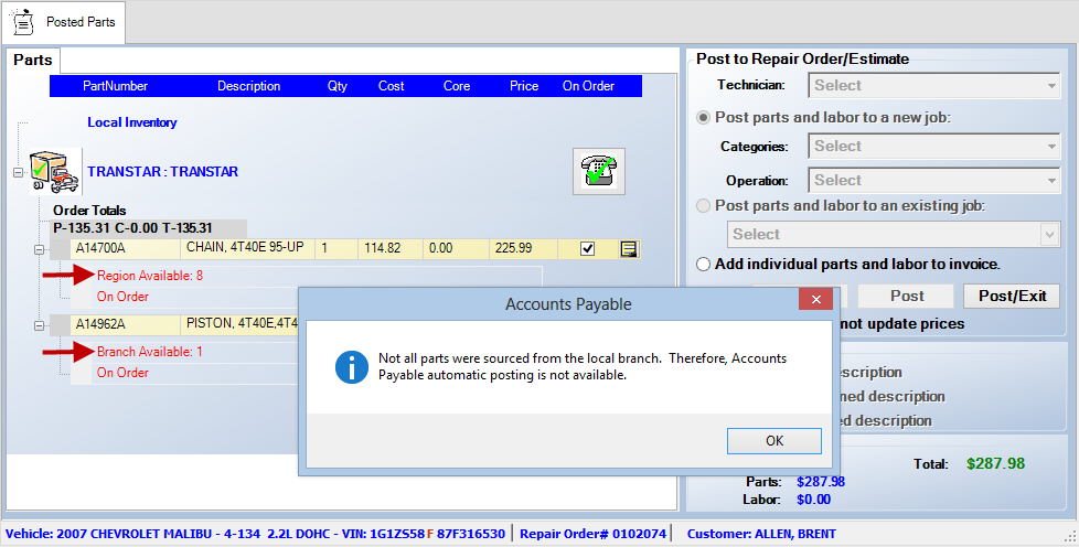 - When posting to Accounts Payable in Smart eOrder, all parts must be ordered from the same location. If you order parts from multiple locations – both Branch and Region - you need to post an invoice to Accounts Payable for each location, even if all the parts are on one repair order.