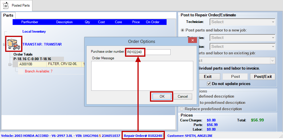 - Click the Post/Exit button to update the parts on the open repair order. Smart eOrder closes and the parts on the repair order now appear black.