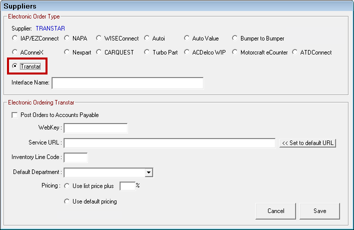Choose the default department to use for Transtar. This list contains parts departments and one should be created for Transtar and selected here. |