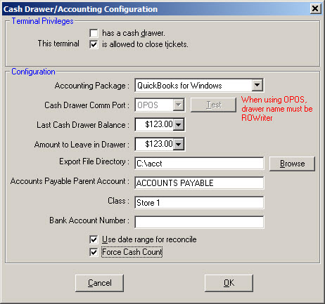 This should be checked if you have an electronic cash drawer attached to your computer that interfaces with R.O. Writer.