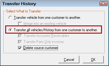 - Select Transfer All Vehicles/History From One Customer to Another and Delete Source Customer.