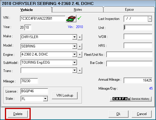 You can only delete a vehicle if there are no appointments, repair orders, or accounts receivable activity associated with this vehicle. If you try to delete a vehicle that does, an error message appears and you cannot delete it.