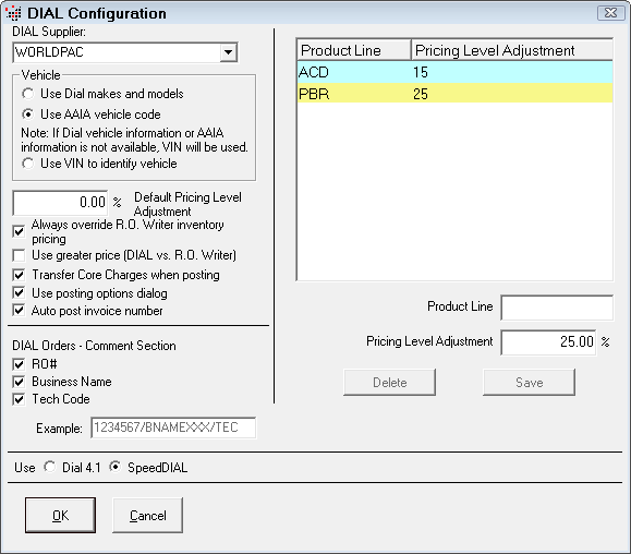 This section allows you to specify pricing level adjustments for specific WORLDPAC parts lines. These are percentage mark-ups (positive or negative) made to the WORLDPAC list price of a part, specific to a parts line.
