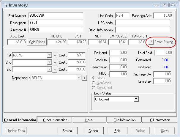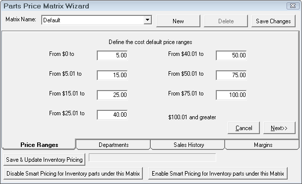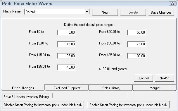 Smart pricing gives the user the ability to set pricing using cost ranges by supplier, parts department or type of work. You will now be able to price inventory parts using smart pricing matrices.