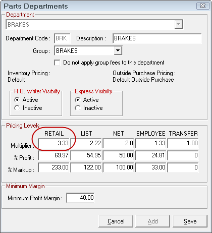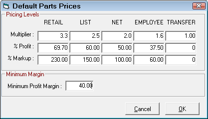 Also as part of the default pricing, there is a minimum margin that must be set. This should be set several percent lower than the retail margin. If the overall profit margin for a part falls below this amount, R.O. Writer will warn the user, and ask if the pricing should be modified. As a starting guideline, set the minimum about 1.5 to 2.0 percentage points lower than what is set for the retail margin.