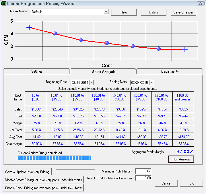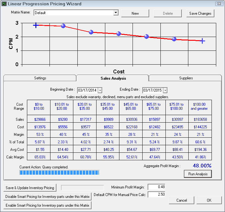 Based on the cost ranges you set and your included departments, R.O. Writer will run an analysis of your actual purchases during the date range.