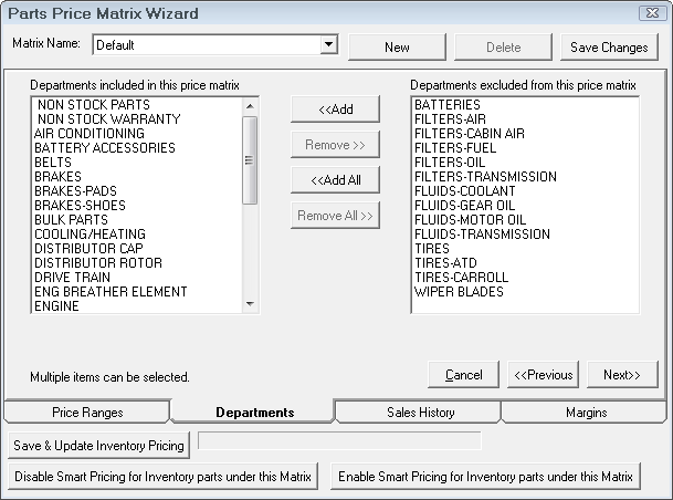 You are able to globally enable or disable smart pricing on all parts that would be affected by the selected matrix including parts marked as stock, non-stock, or consigned by selecting the Disable Smart Pricing for Inventory parts under this matrix button or the Enable Smart Pricing for Inventory parts under this matrix button.