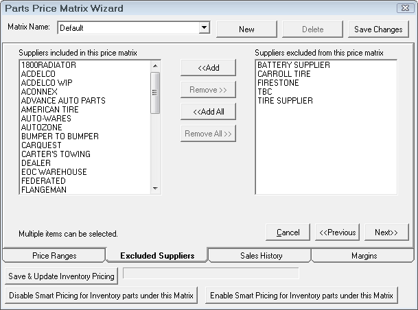 Select the dropdown list to edit other matrices. Click the New button to create a new matrix for alternate suppliers. It is recommended when naming new matrices to use a descriptive enough name so you can identify the correct matrix when editing (Example: CARQUEST Inventory or CARQUEST Outside Purchase). Click the Save Changes button to save the matrix.