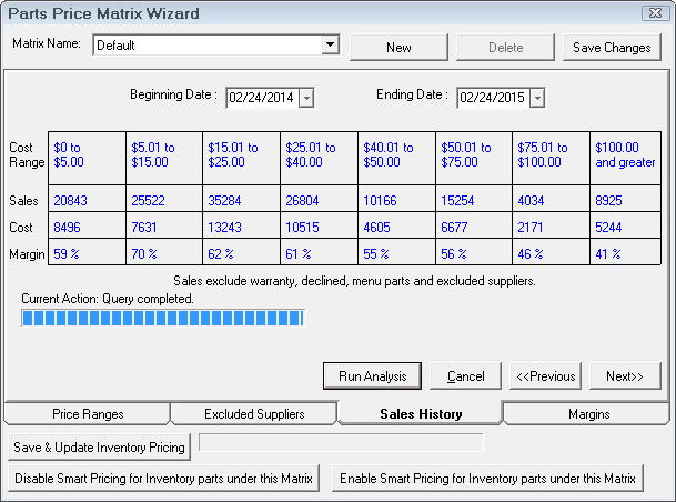 If historical information is available, the next step would be to review the parts sales history to see what the historical margins have been for the newly established pricing range. This information could prove to be useful in establishing the pricing matrix margins. If historical information is not available, the user would proceed to the next step of establishing margins for each of the pricing levels.