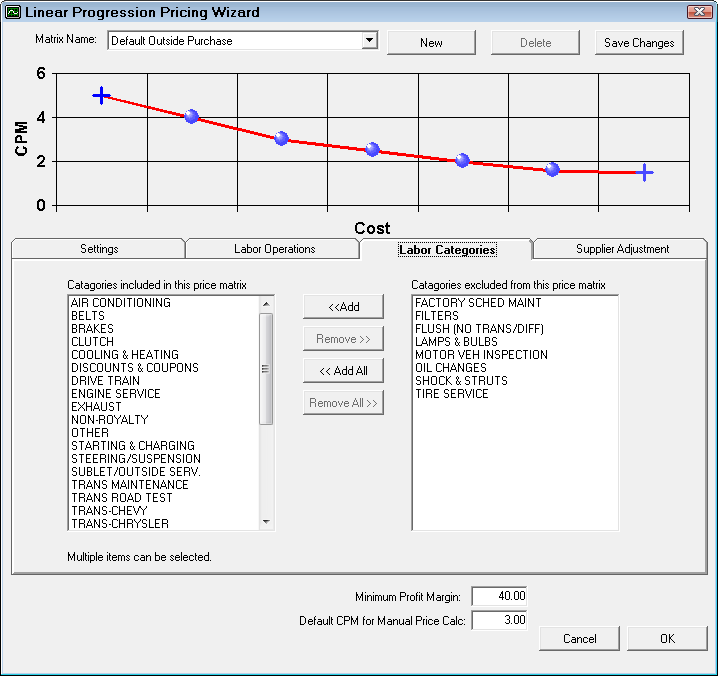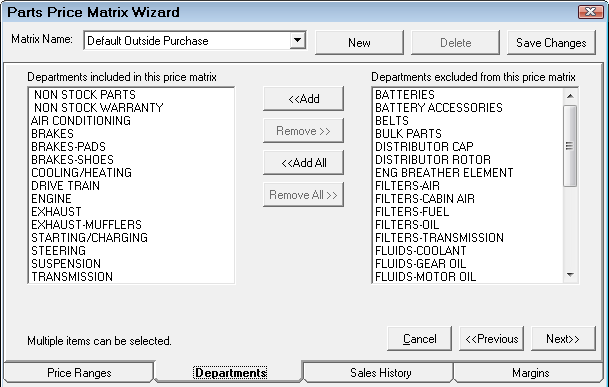 Select the dropdown list to edit other matrices. Click the New button to create a new matrix for alternate departments. It is recommended when naming new matrices to use a descriptive enough name so you can identify the correct matrix when editing (Example: Brakes Inventory or Brakes Outside Purchase). Click the Save Changes button to save the matrix.