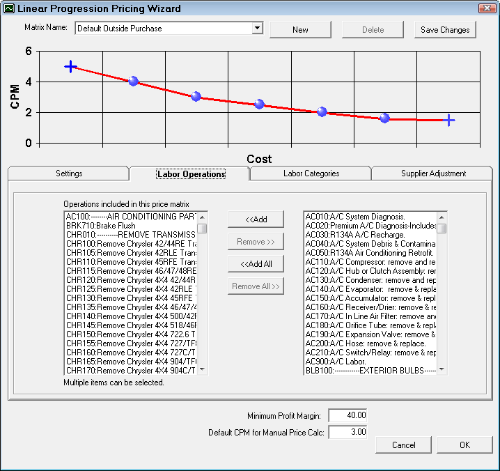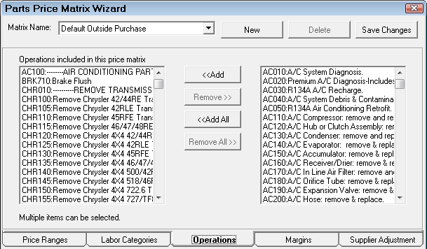 If you only want to include one or more labor operations within a category and not the entire category, here you can select the labor operations that are to be included in the pricing matrix. Individual operations may have their own pricing matrix.