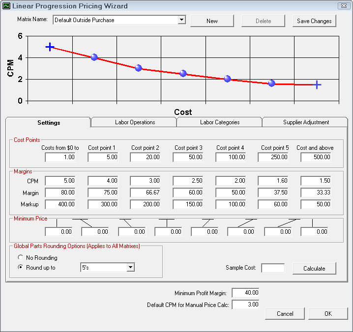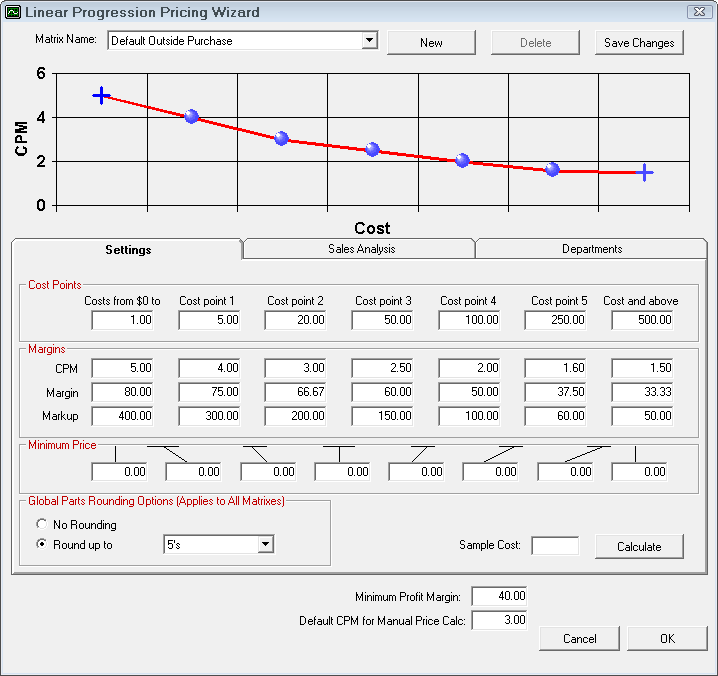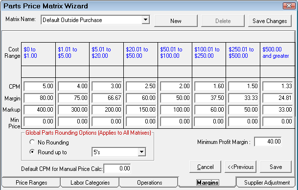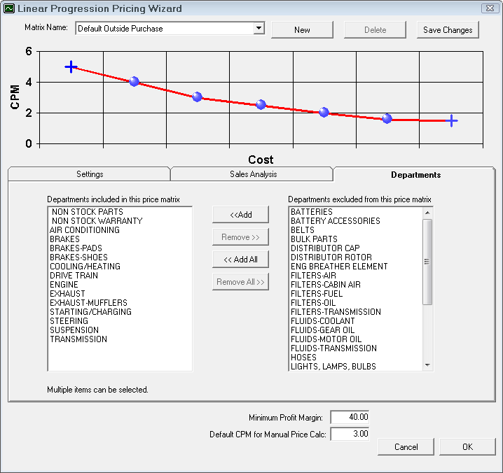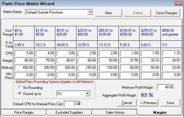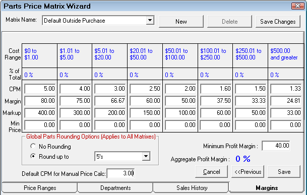 NOTE: This is the default CPM matrix. When parts departments are selected, the matrix for that department is used. To access the matrices for each department, select Configuration > Parts > Parts Departments.