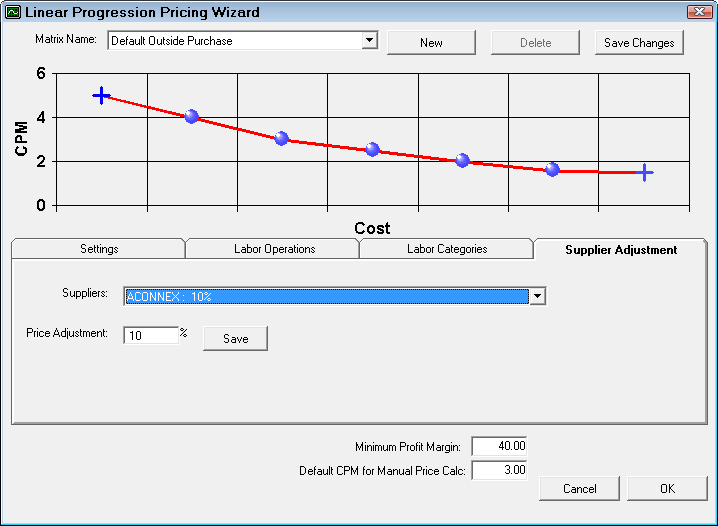 When using pricing by associated labor, you also have the option to adjust the final calculated price per parts supplier on the last tab, Supplier Adjustment.