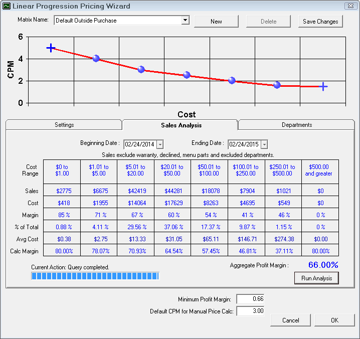 Based on the cost ranges you set and your included departments, R.O. Writer will run an analysis of your actual purchases during the date range.