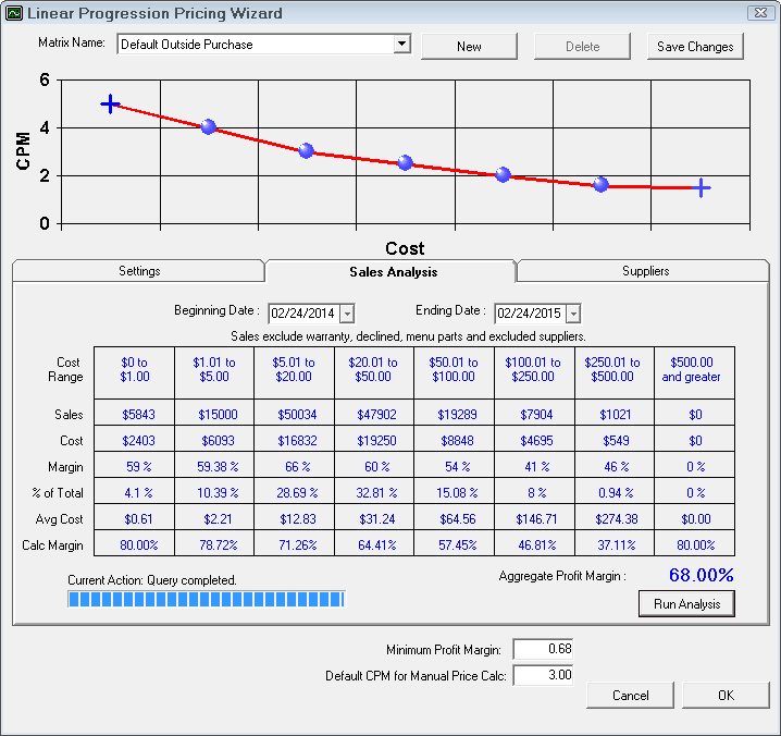 Based on the cost ranges you set and your included suppliers, R.O. Writer will run an analysis of your actual purchases during the date range.