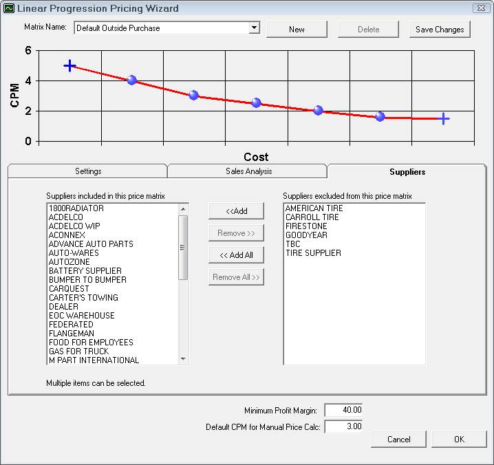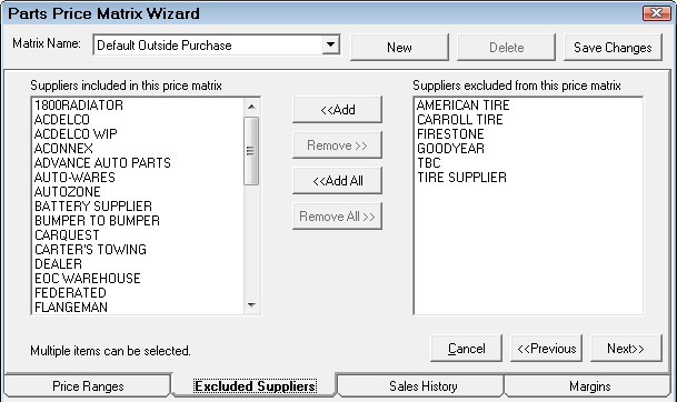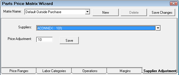 Select the dropdown list to edit other matrices. Click the New button to create a new matrix for alternate suppliers. It is recommended when naming new matrices to use a descriptive enough name so you can identify the correct matrix when editing (Example: CARQUEST Inventory or CARQUEST Outside Purchase). Click the Save Changes button to save the matrix.