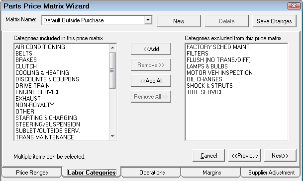 Select the dropdown list to edit other matrices. Click the New button to create a new matrix for different types of labor. It is recommended when naming new matrices to use a descriptive enough name so you can identify the correct matrix when editing (Example: Brake Inventory or Brake Outside Purchase). Click the Save Changes button to save the matrix.