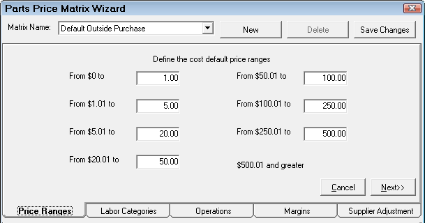 Define the cost ranges. If there are certain types of labor that will have different pricing, decide which categories and/or operations are priced differently and separate matrices can be created. Click the New button to add a new price matrix.