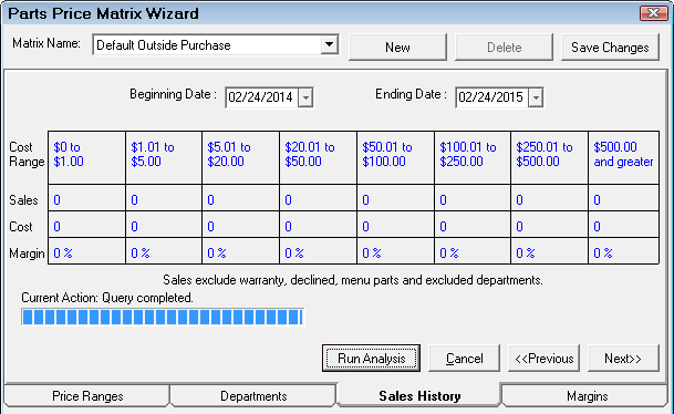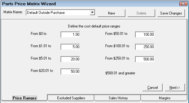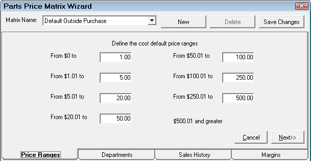 If historical information is available, the next step would be to review the parts sales history to see what the historical margins have been for the newly established pricing range. This information could prove to be useful in establishing the pricing matrix margins. If historical information is not available, the user would proceed to the next step of establishing margins for each of the pricing levels.