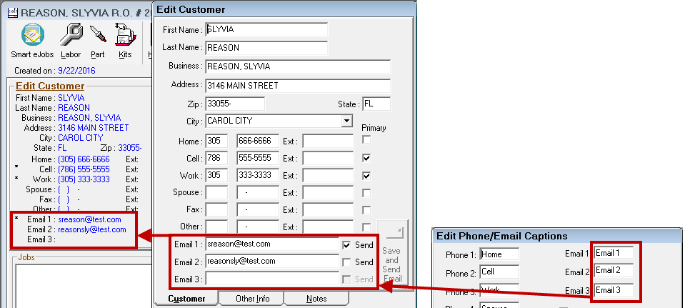 - The label for each email field on both the Edit Customer and Parts/Labor tab is customizable in Configuration (Configuration menu > Customer > Edit Phone/Email Fields).
