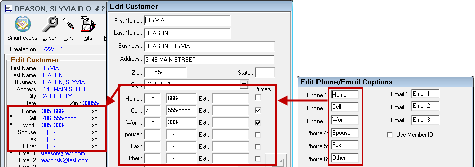 - The label for each phone number field on both the Edit Customer and Parts/Labor tab - "Home", "Work", "Cell", etc. - is customizable in Configuration (Configuration > Customer > Edit Phone/Email Fields).