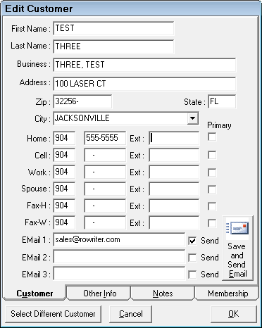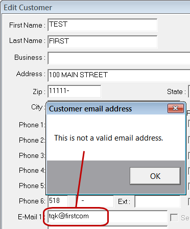 R.O. Writer validates any email address entered on the Edit Customer window when you click OK at the bottom of the Edit Customer window. To be considered valid in R.O. Writer, the format of the email must be: text@text.text