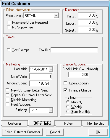 Enter financial and marketing information for this customer. This information does not appear on the repair order.