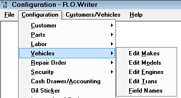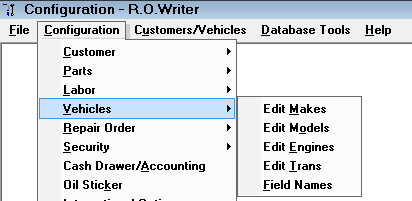 R.O. Writer comes with an extensive list of vehicle makes and models; however, this list is not all inclusive of every make and model vehicle that has ever been produced. Because of this it may be necessary to edit the makes and models of vehicles. The list of engines and transmissions for these vehicles is not all-inclusive and, therefore, may require editing as well.