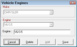 The list of vehicle engines is specific to the vehicle make, and not the model. If a particular engine size does not appear for the selected vehicle make, click the Add button, and enter the engine size in the Engine box on the bottom. Click the Save button to save the entry. When the information has been saved, click the Cancel button to exit.