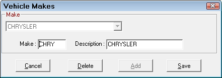 If the vehicle make that you need does not appear in the list, click the Add button. Enter a four-character code for the vehicle in the Make box, and the vehicle name in the Description box. Each four-character code for the make must be unique. Click the Save button to save the entry. When the information has been saved, click the Cancel button to exit.