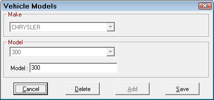 If a particular vehicle make is selected, and the model needed does not appear in the list, click the Add button. Enter the vehicle model in the Model box at the bottom. Click the Save button to save the entry. When the information has been saved, click the Cancel button to exit.