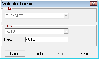 The list of vehicle transmissions is specific to the vehicle make, and not the model. If a particular transmission does not appear for the selected vehicle make, click the Add button, and enter the transmission type in the Trans: box on the bottom. Click the Save button to save the entry. When the information has been saved, click the Cancel button to exit.