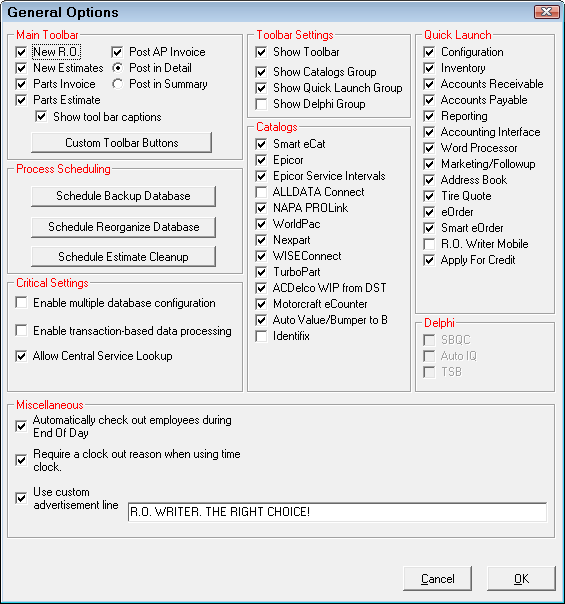 Only if you would like to be able to cancel or undo a detailed invoice when posting to Accounts Payable. When posting detailed invoices, theInvoice Details window has an Undo Inv. button. WARNING: If you turn this option on, DO NOT click Continue on any error messages in R.O. Writer. Always choose to Exit R.O. Writer instead. If you choose Continue on an error message, everything you do afterward will be lost. |