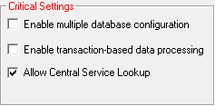 Enable Multiple Database Configuration | To use multiple locations (which means multiple databases)that have already been established. This option is necessary if you are using the Central Office. |