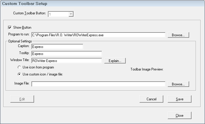 - Select 1, 2, or 3 in the Custom Toolbar Button dropdown list. The Edit button activates.