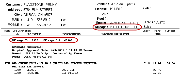 The system displays two separate mileage fields for the vehicle: one for in and one for out. The mileage when the vehicle came in and the mileage when the vehicle was picked up.