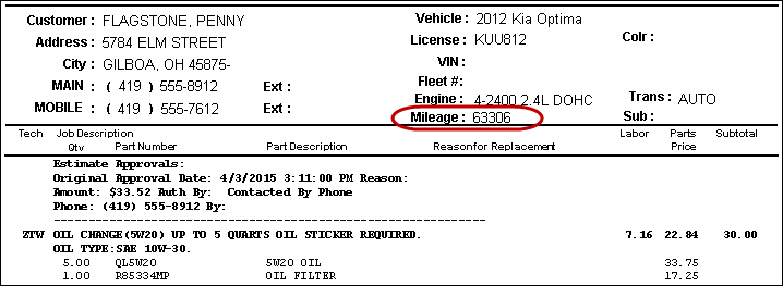 The first example is when the option Leave Mileage blank is selected and the second example is when the option Keep current vehicle Mileage is selected.