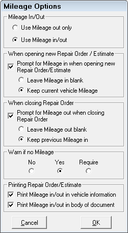 Prompt for Mileage in When Opening New Repair Order/Estimate - When this option is selected, an input box would appear prompting for the mileage of the vehicle when a new repair order or estimate is opened.