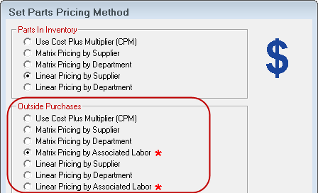 R.O. Writer has seven different methods to assist you in pricing outside purchases of non-stock parts. The options are: