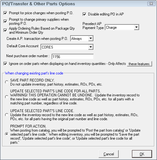 The last section contains options for updating existing part line codes when they come over from one of the online catalogs.