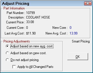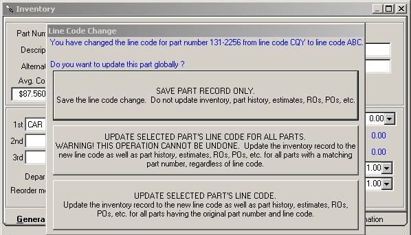 When a line code is entered or changed, you are prompted to see if you want to change the line code on the selected part or all parts with the same part number in inventory and history. This allows you to select the option that is best for that specific part number.