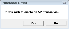 This option can be set to Always, Never or Prompt to create an accounts payable transaction when posting a purchase order. When Prompt is selected, you will see the following prompt when posting a purchase order.