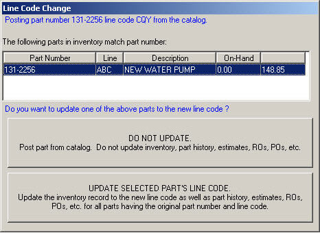 Do not update inventory, part history, estimates, repair orders, purchase orders, etc. This option will not update to the new line code and will merely add the duplicate part number.