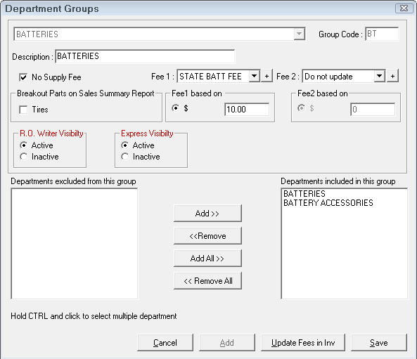 Parts department groups provides a quick way to globally attach one or two fees and/or exclude the Shop Supply Fee to all parts in the group.