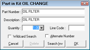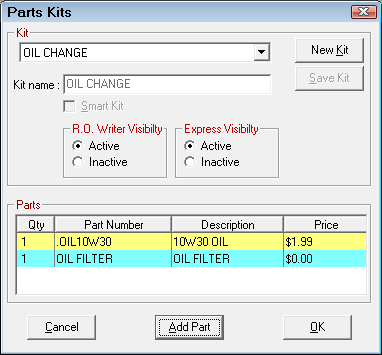 There are some jobs that consistently require the same parts. For example, an oil change requires oil and usually an oil filter. You could add the oil and then the oil filter separately every time. To save time, you could create a parts kit that contains both the oil and the oil filter and then add the parts kit instead.