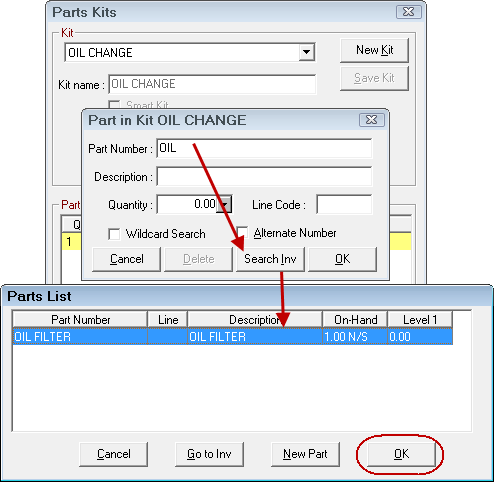 - To search for the part, enter the Part Number or Description and click the Search Inv button. The Parts List appears with the matching parts.