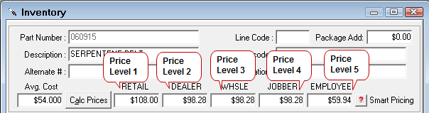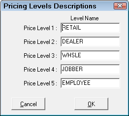 The price level descriptions entered here appear on the General Information Tab of parts in the Inventory module. Price Level 1 is first, Price Level 2 is second, and so on.
