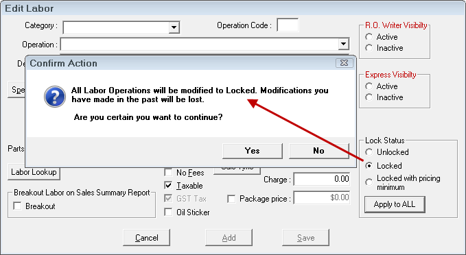 - Click the Apply to All button. A prompt appears asking you to verify the price lock of all labor operations.