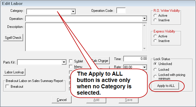 The Apply to ALL button in the Lock Status section of the Edit Labor window locks the current price for all labor operations in the system. It appears only when no Category or Operation is selected and disappears when a Category is selected.