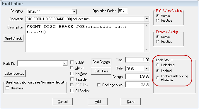 You can lock the price on labor operations. This means that any time a locked (or partially locked) labor is added to an estimate or repair order, the price is locked and cannot be changed.